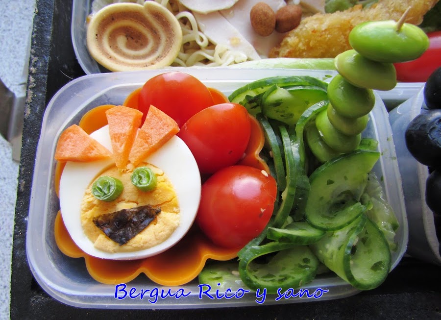 1. En un molde de silicona para magdalenas tenemos medio huevo duro decorado con picos de zanahoria, cebolleta por ojos y una esquina de alga nori para sushi como boca. A su derecha tenemos mitades de tomate cherry.