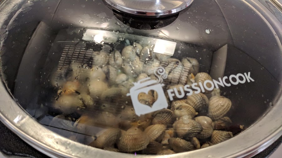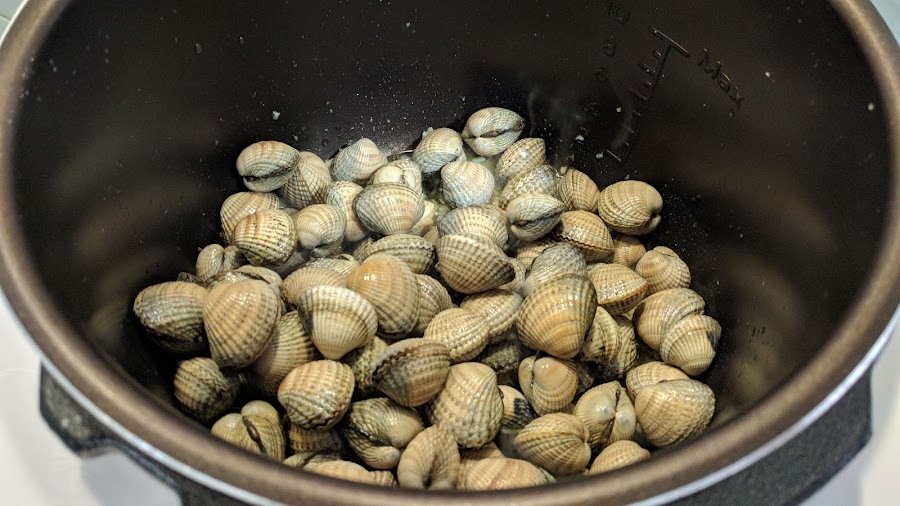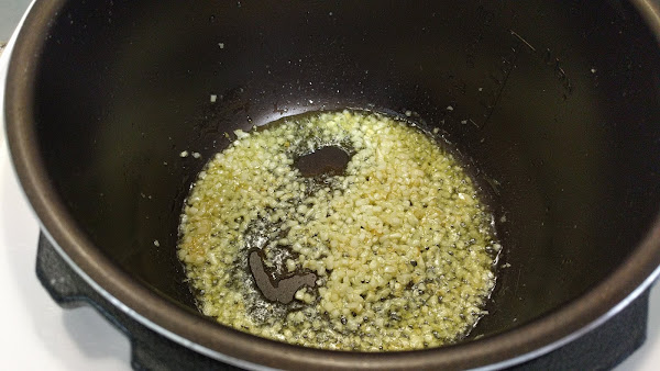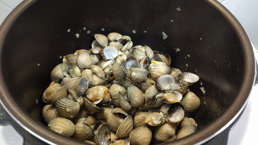 Cubre el fondo de la cubeta con aceite. Programa menú freif y añade el ajo. Cuando empiece a dorarse incorpora los berberechos y remueve