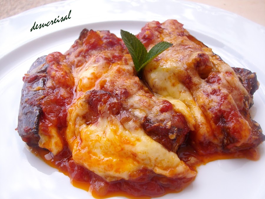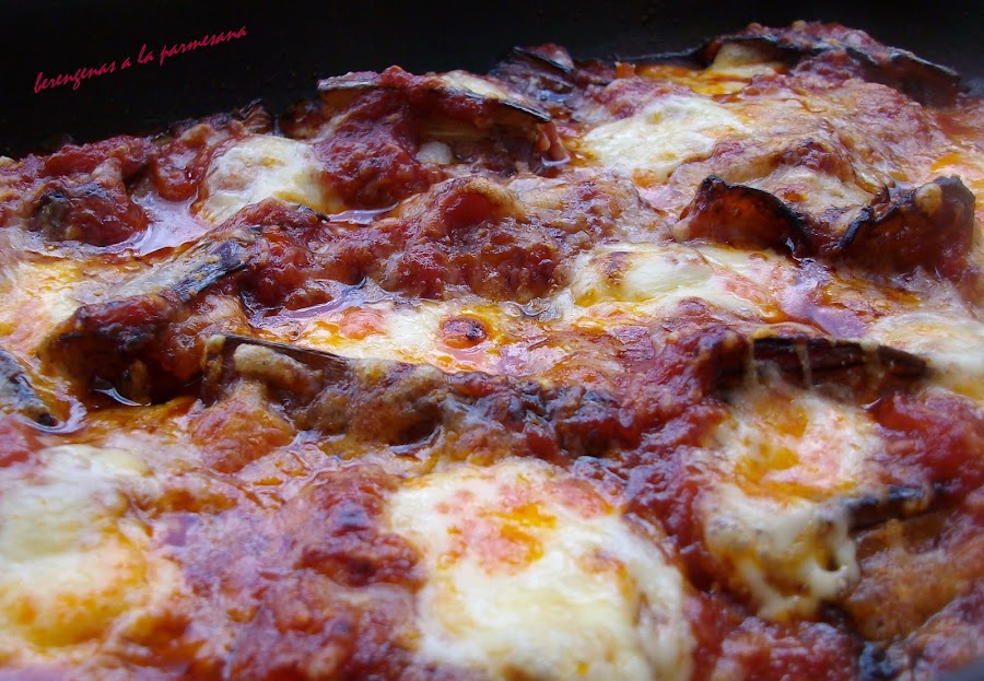 En una fuente para horno ,poner una capa de salsa de tomate , luego una de berengenas , espolvorear con el queso parmesano,añadir una capa de mozzarella en rodajas ,dejando sitio entre cada rodaja de queso