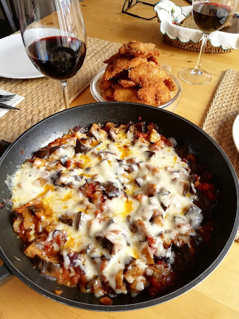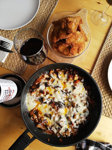 3. Justo cuando vayas a sacar la sartén a la mesa, caliéntala un poco y ponle la mozarella fresca a trozos y un buen puñado de queso parmesano rallado.