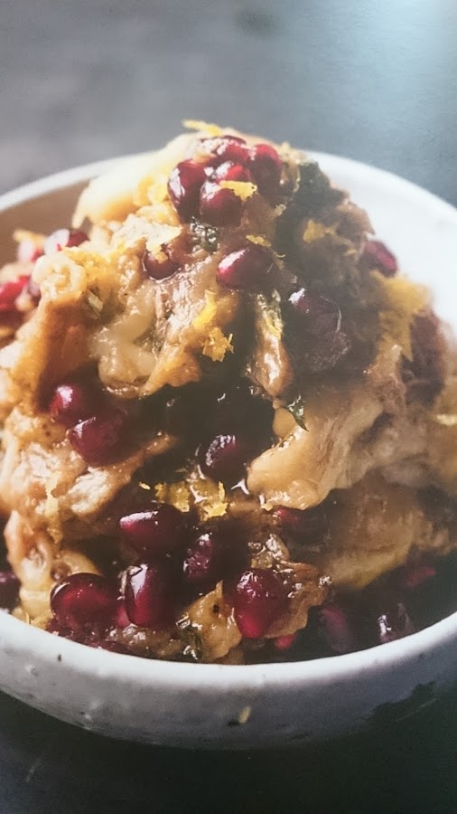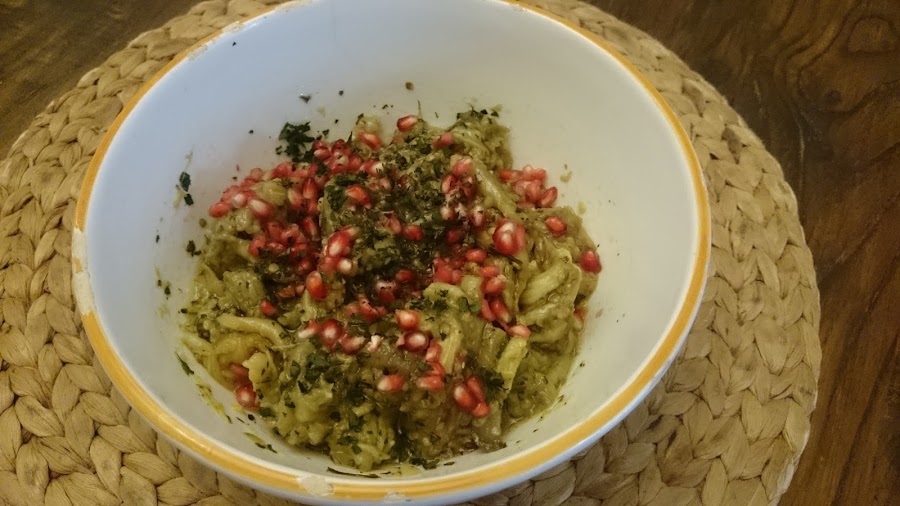 En el momento de emplatar, añadimos la mayor parte de las hierbas aromáticas a la mezcla y removemos, probamos por si hay que rectificar de sal. En el centro de un plato formamos un montoncito de esta mezcla, repartimos por encima los granos de granada y decoramos con el resto de las hierbas.