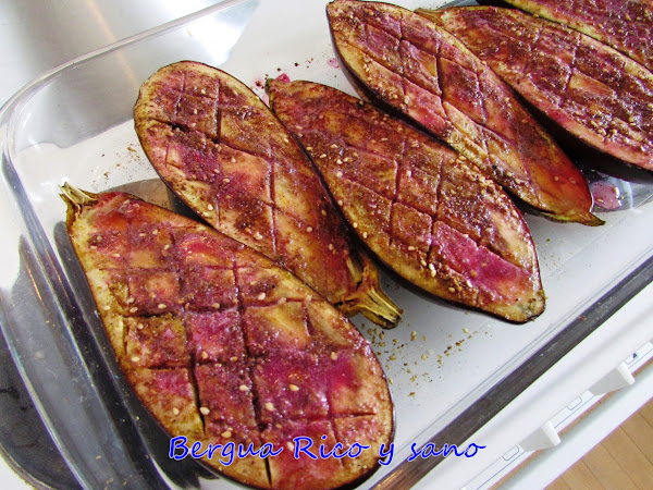 2. A continuación repartimos una cucharada o una y media de aceite en cada berenjena, asegurándonos de que entre por los cortes. Lo siguiente es espolvorear con la mezcla de especias por toda la superficie. Las ponemos a asar durante 30-40 minutos hasta que la carne quede blandita.