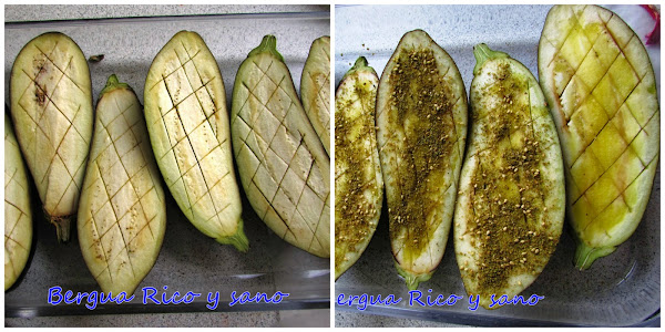 1. Ponemos el horno a precalentar a 200º. Lavamos nuestras berenjenas y las abrimos por la mitad a lo largo. Hacemos cortes profundos a rombos sin atravesar la berenjena por completo.