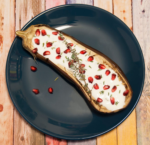 Cuando las berenjenas estén listas, pasadlas a un plato, echad la salsa de yogur por encima y terminad con los granos de granada y algunas hojitas mas de tomillo.