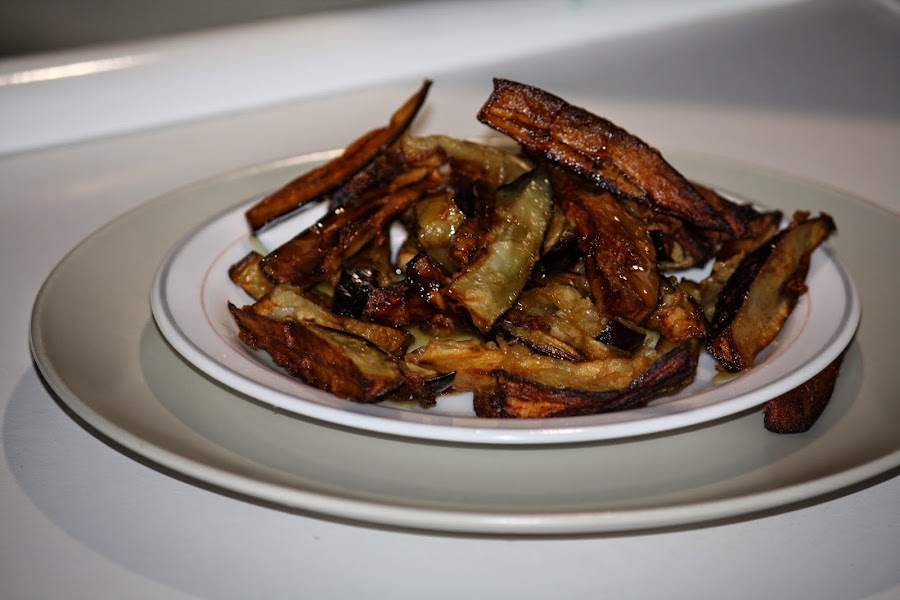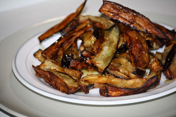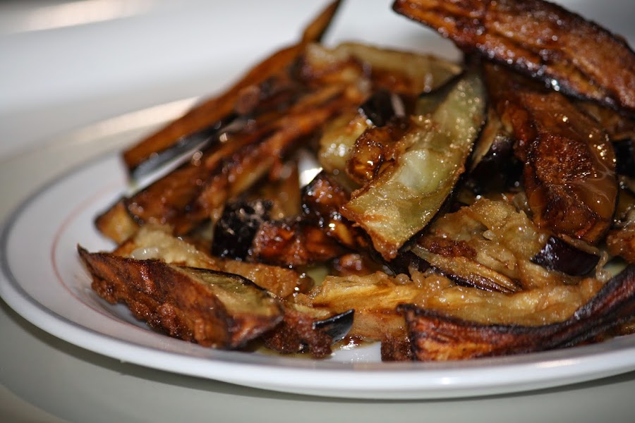 Vamos friendo en aceite muy caliente hasta que tomen color, escurrimos el exceso de aceite dejando las berenjenas unos minutos en un plato con papel absorbente y por último servimos rociadas con un hilo de miel de caña.