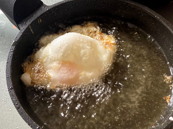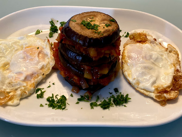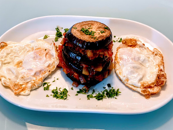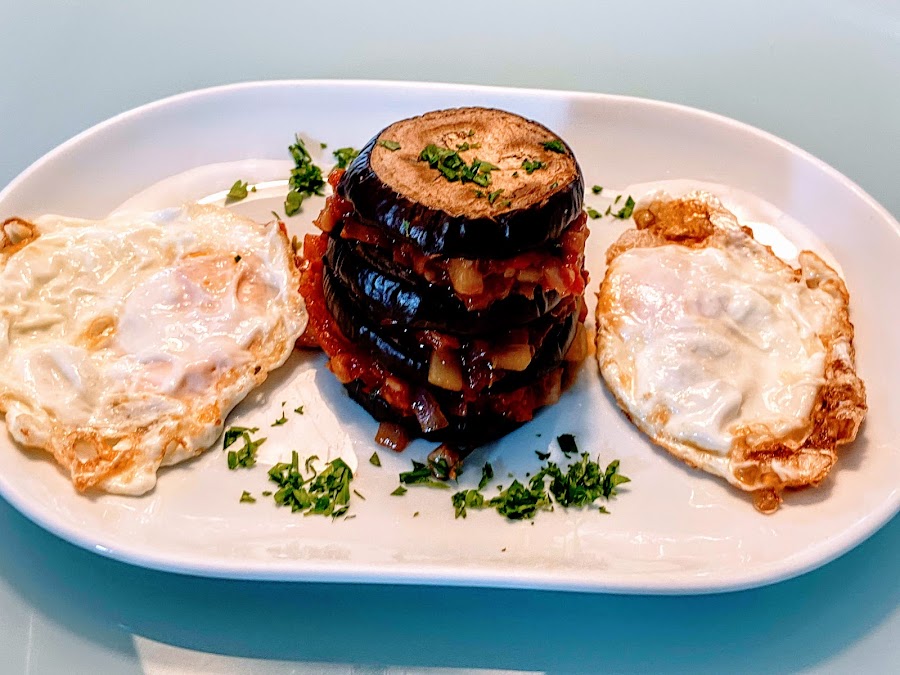 Completamos el plato con dos huevos fritos y con unas hojitas de perejil picado.