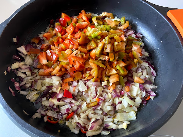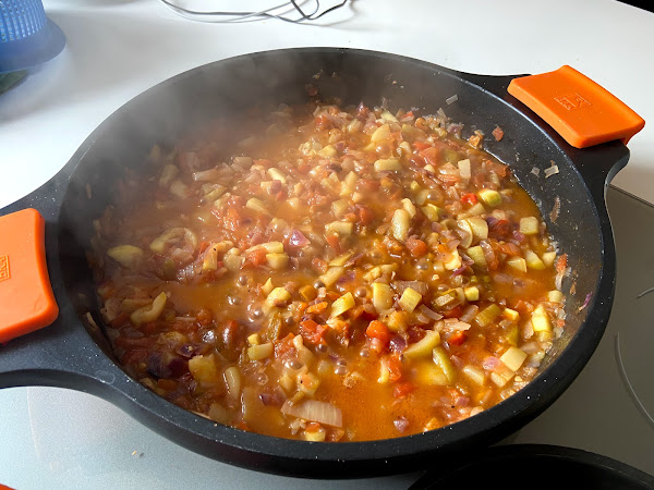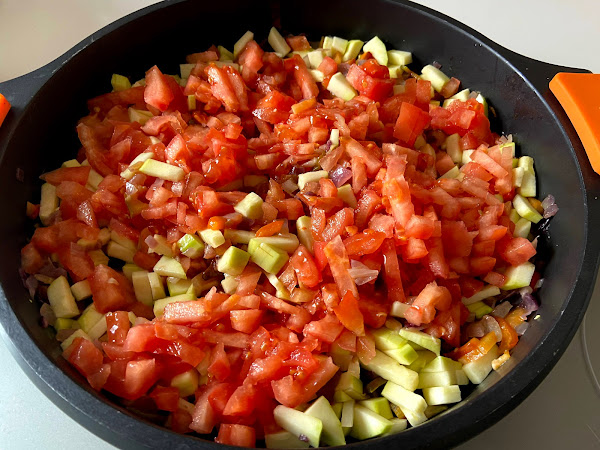 Por último introducimos los tomates cortados, subimos la potencia de fuego a 7-9 y dejamos hasta reducir.