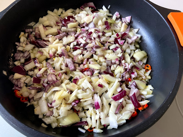 Introducimos en la cazuela baja las cebollas y dejamos cocinando durante 20 minutos.