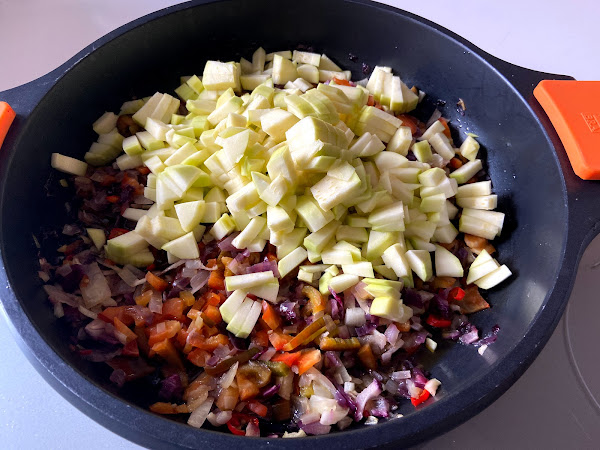 Transcurrido el tiempo ponemos el calabacín cortado y cocinamos con potencia de fuego 5-9 durante 10 min.