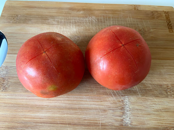 Primero pelamos los tomates les hacemos una cruz en la base del tomate.Escaldamos durante 20 segundos en agua caliente.