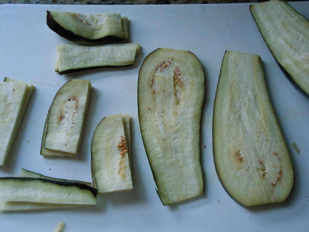 Lavar la berenjena y sin quitar la piel cortar a lo largo tiras finas.