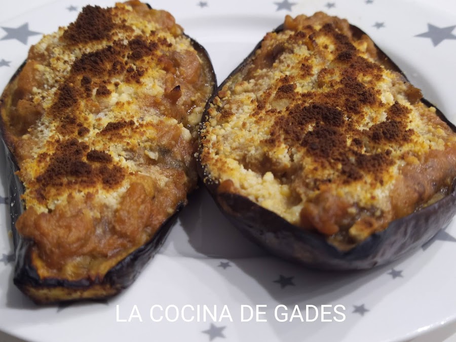 Rellenamos las berenjenas, cubrimos con el queso en polvo y gratinamos.