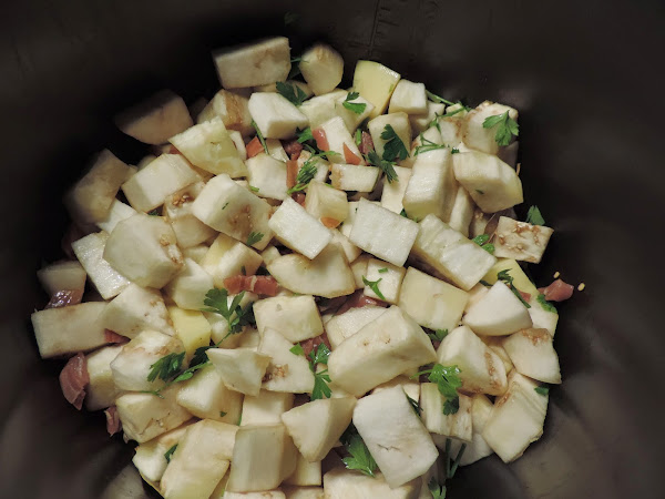 Pelamos y cortamos en trozos las berenjenas y las ponemos con las patatas en la cubeta de la olla.