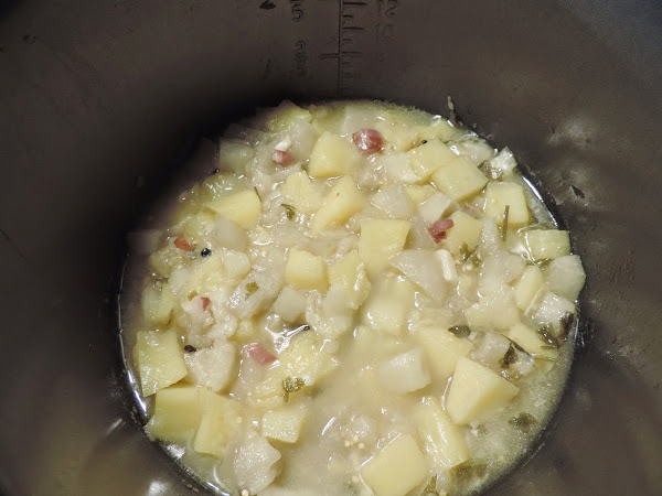 Pelar y cortar la patata en trozos, la ponemos en la cubeta de la olla.