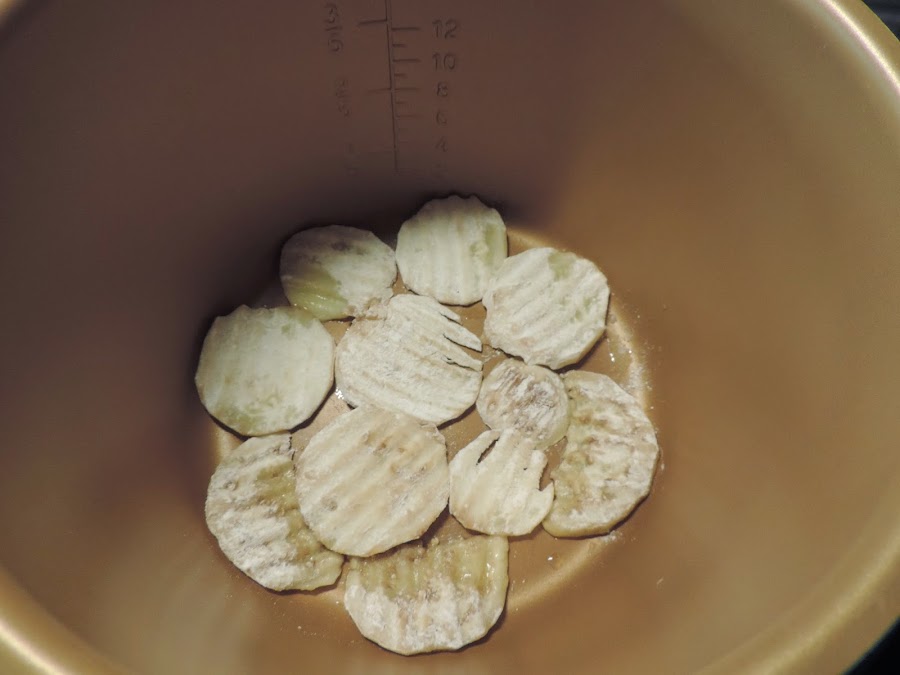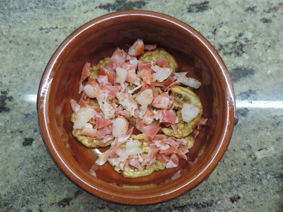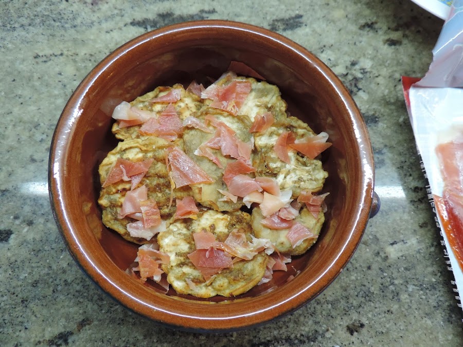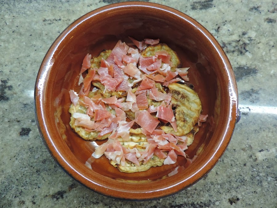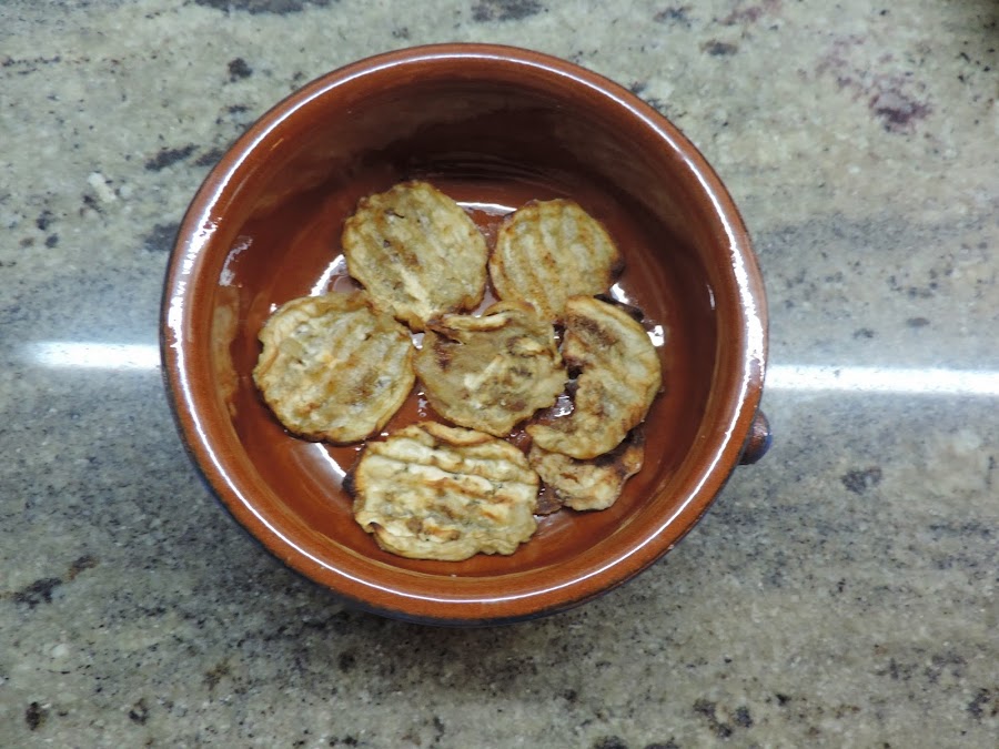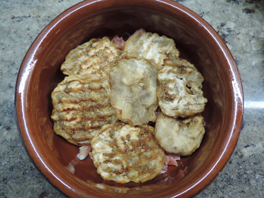 Poner un poco de aceite de oliva y unas rodajas de berenjena, las tendremos que hacer en tantas.