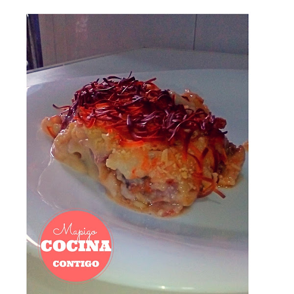 El siguiente paso es colocar en una fuente para horno las rodajas de berenjenas, haciendo una cama. Encima colocamos las gambas y las lonchas de jamón serrano. Cubrimos todo con la bechamel de gambas que previamente hemos elaborado, y añadimos queso rayado. Lo metemos al horno hasta que gratine.