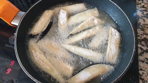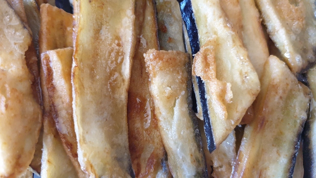 - En una sartén ponemos abundante Aceite de Oliva Virgen Extra y dejamos que caliente bastante. Momento en que echamos de pocas en pocas las berenjenas, dándolas una vuelta hasta que estén bien hechas por todas partes.
