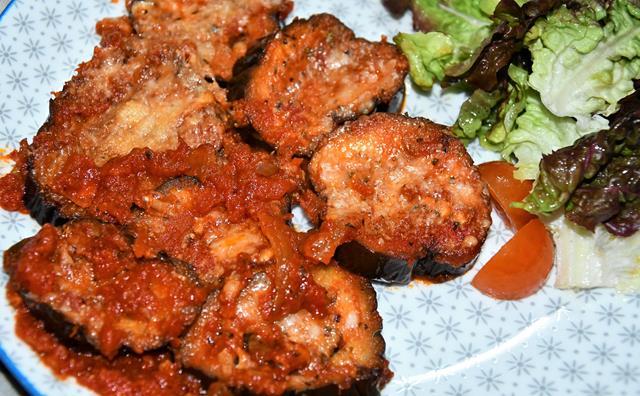En una fuente de horno ponemos una capa de salsa de tomate, una de berenjenas, espolvoreamos con queso y así sucesivamente hasta que se nos acaben las berenjenas. Acabamos con salsa de tomate y queso rallado.