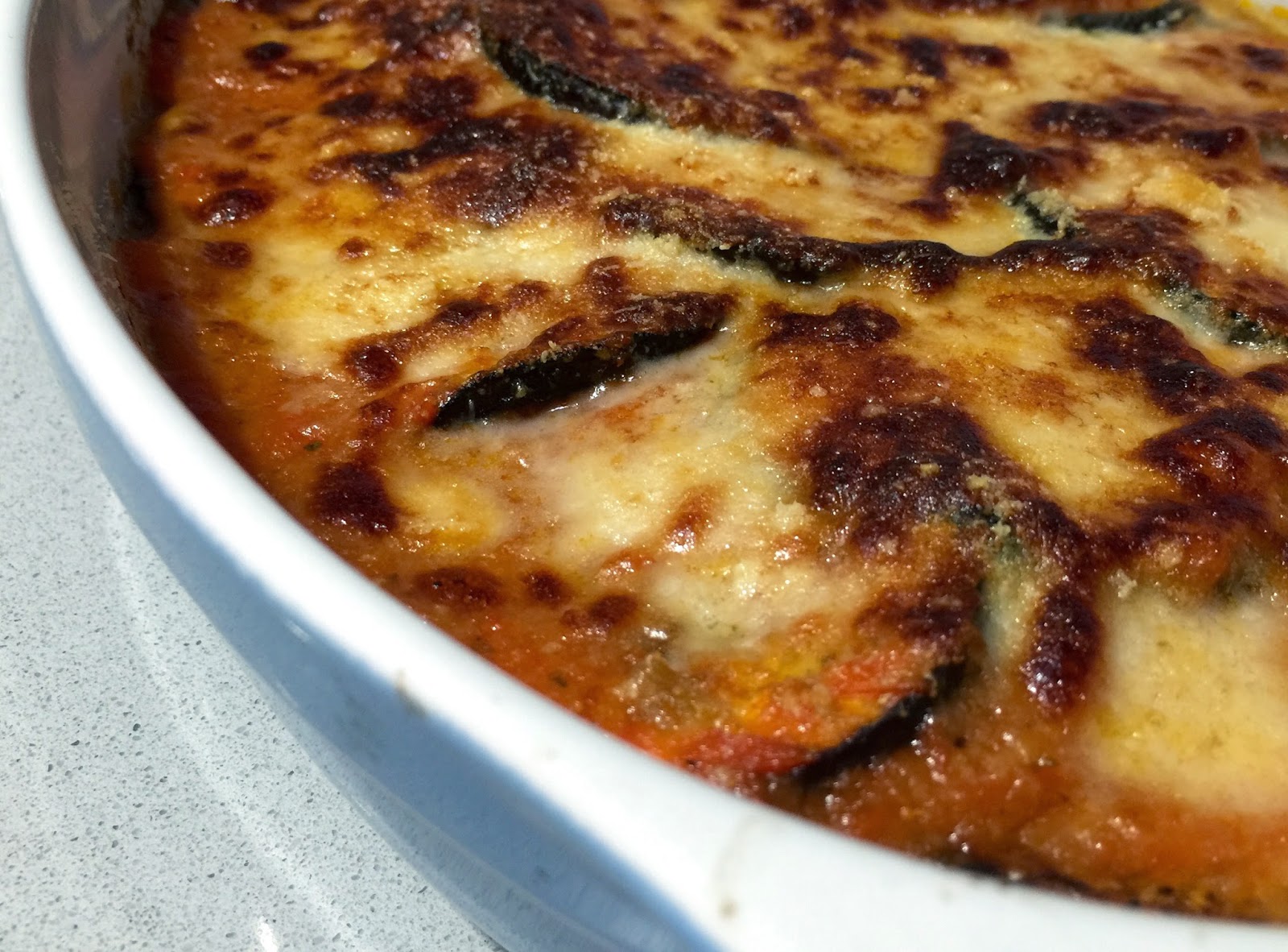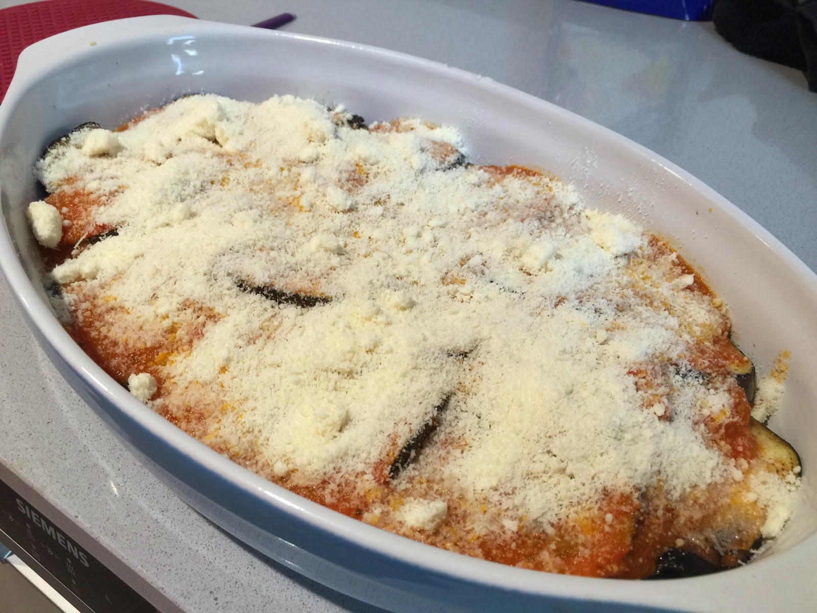 11. Vertemos todo el sofrito que nos queda por encima de las berenjenas. Cubrimos con queso parmesano por encima.