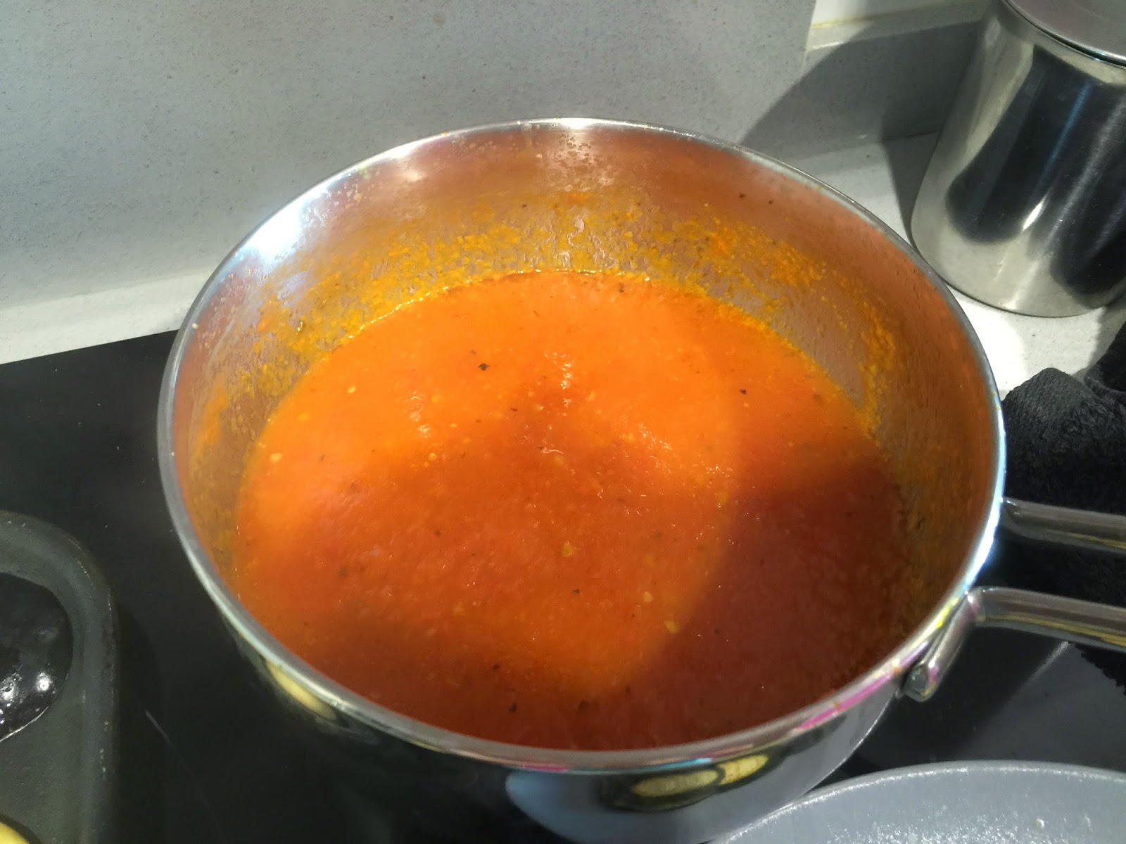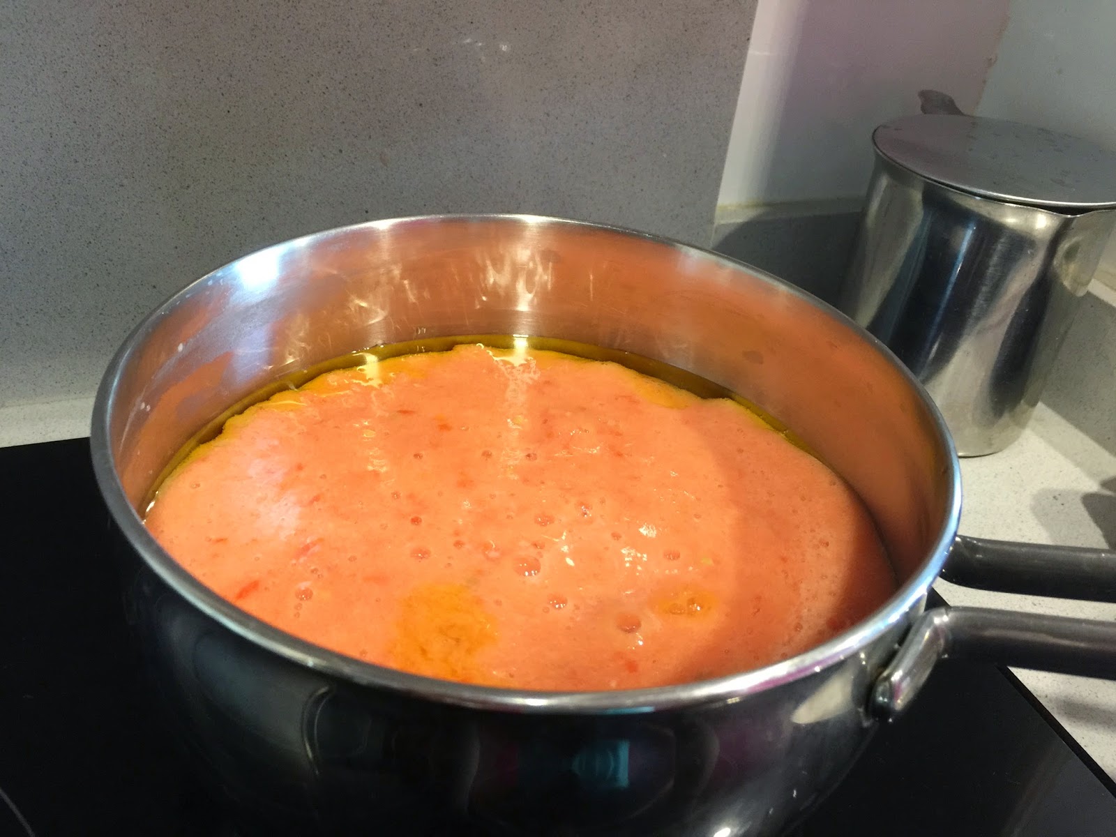 2. En una sartén ponemos un chorro generoso de aceite a calentar. Volcamos la salsa en ella, salamos y sofreímos a fuego medio durante 40 minutos aproximadamente.