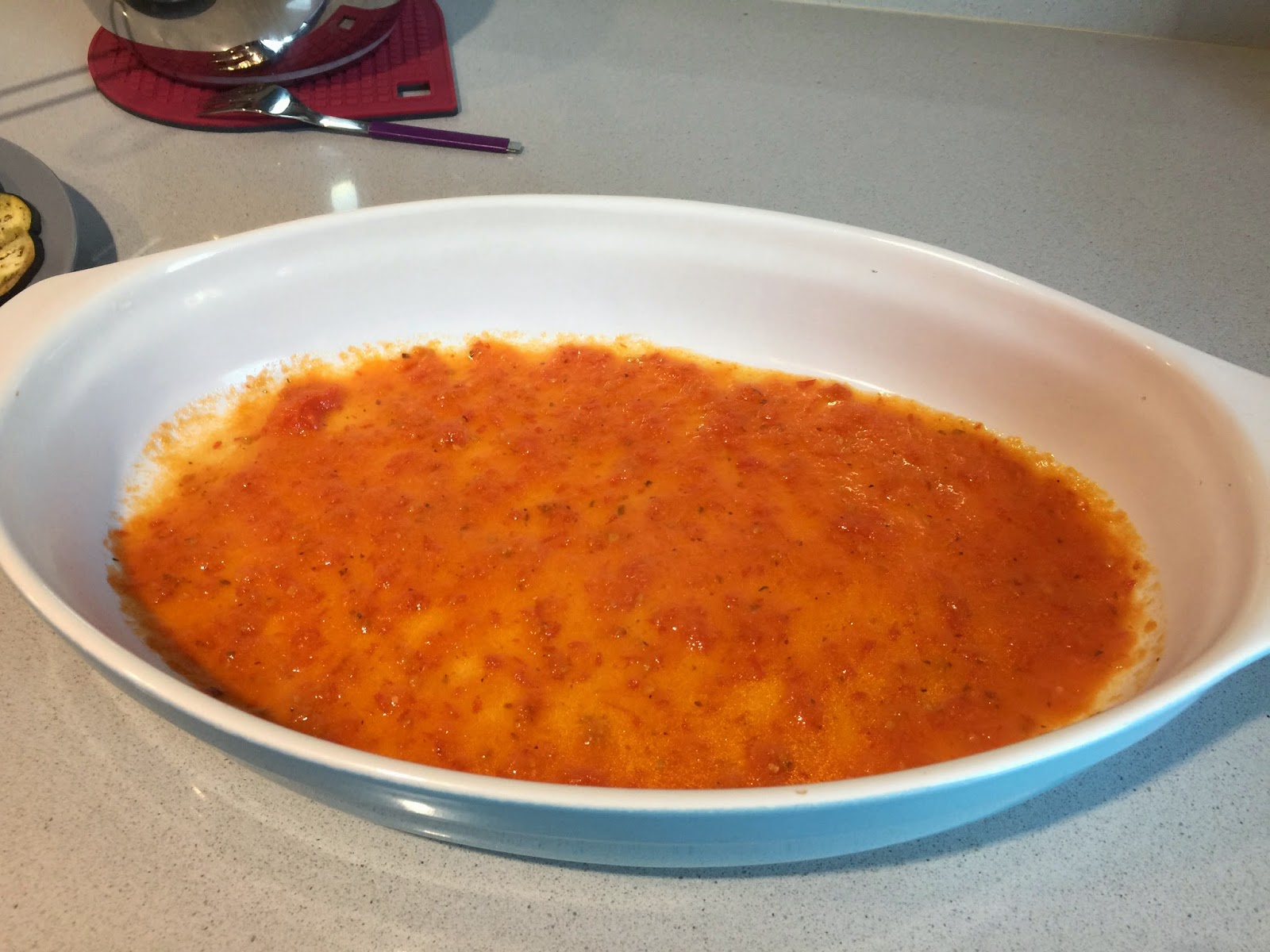 7. Para preparar la badeja, cubriremos la base con un poco del sofrito del tomate. Cubrimos toda la base con una capa de berenjenas.