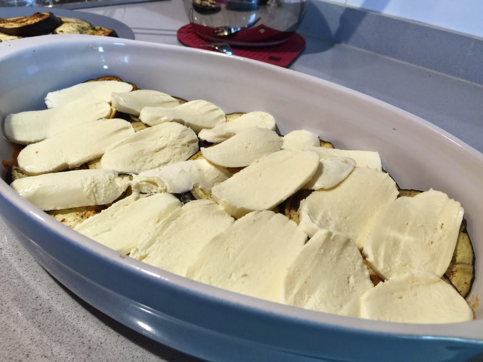 8. Preparamos las mozzarelas, las sacamos de la bolsa, las escurrimos y las cortamos en rodajas igual de gruesas que las berenjenas. Cubrimos la primera capa de berenjenas con la mozzarela.