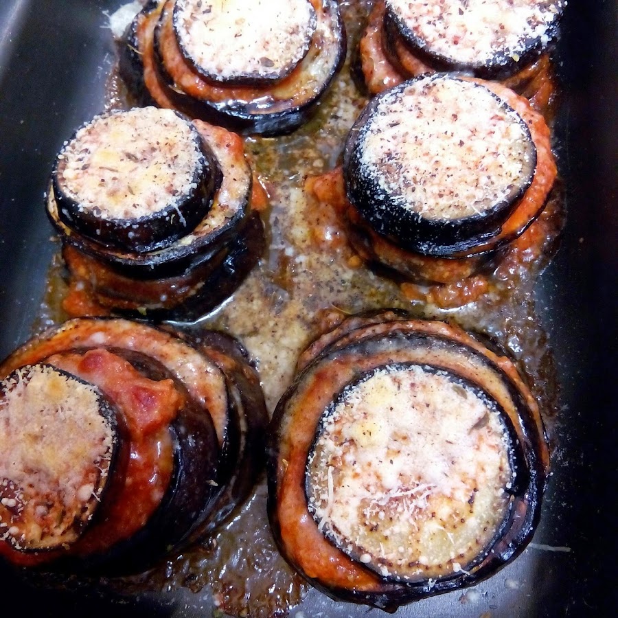 Luego, alternaremos una rodaja de berenjena con salsa de tomate como aparece en la imagen y finalmente añadiremos por encima queso parmesano, orégano y pimienta negra.