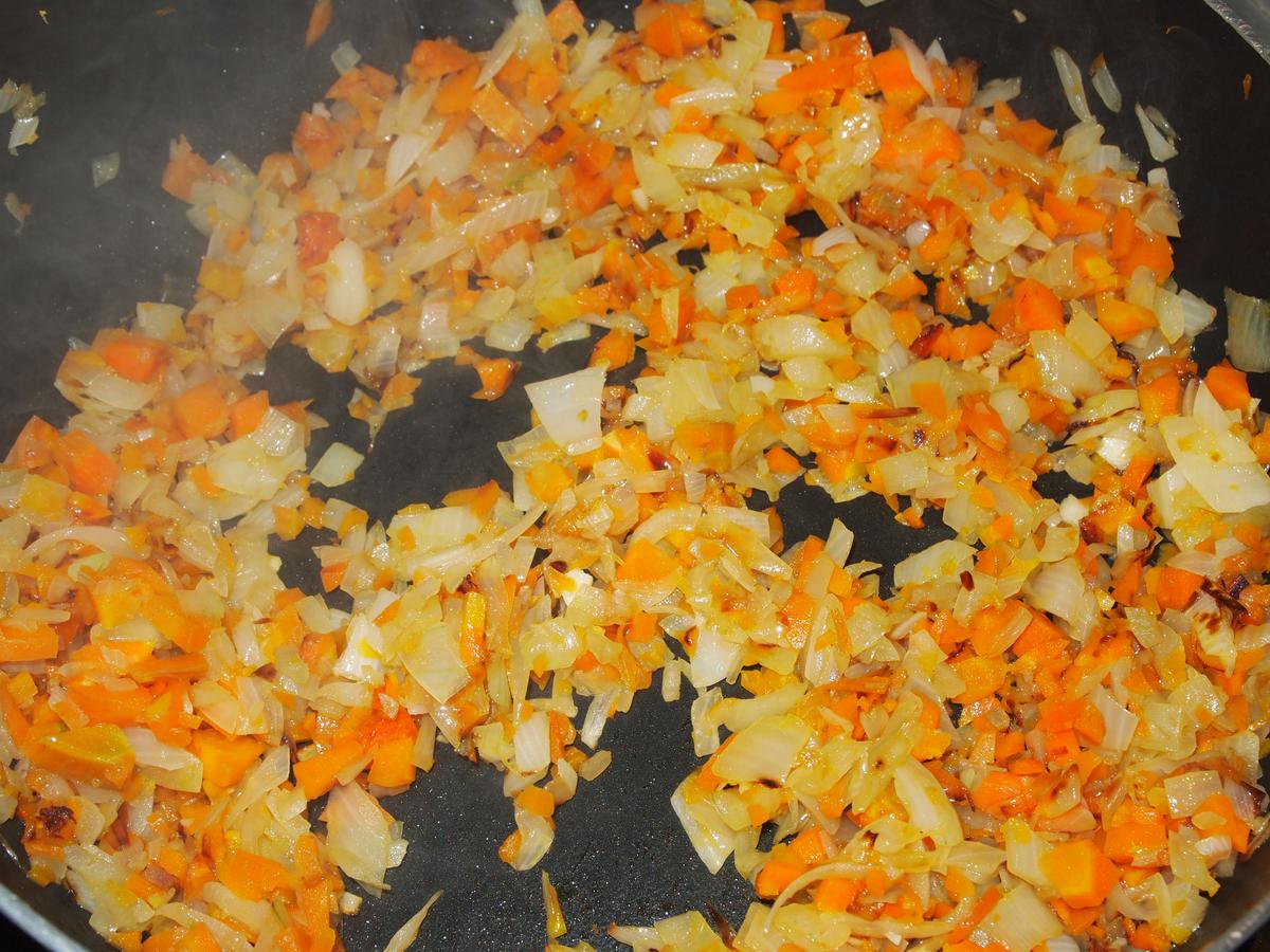 Lavar y picar la cebolla y las zanahorias. Rehogar en una sartén grande con un chorrito de aceite de oliva.