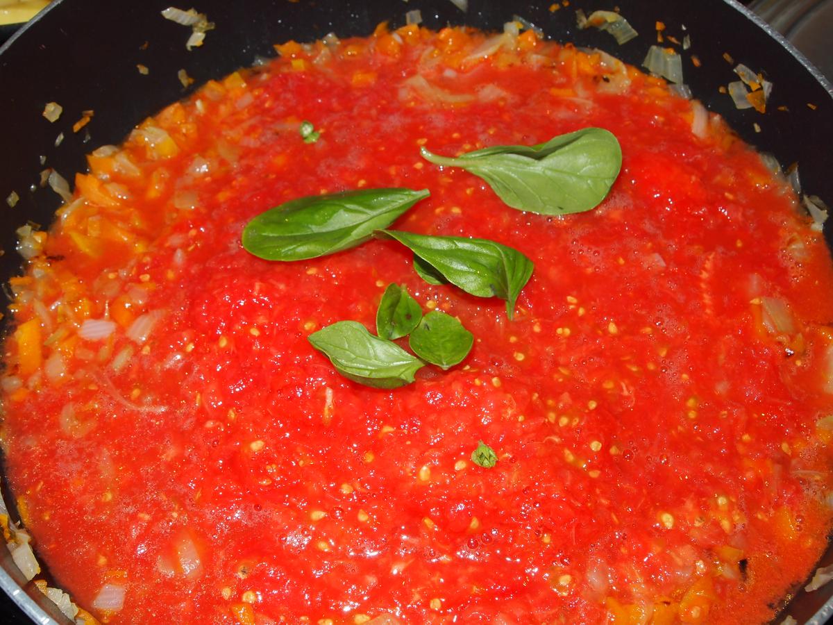 Lavar y rallar los tomates, agregar a la sartén, salpimentar al gusto, añadir unas hojas de albahaca fresca y cocinar a fuego medio durante 30 minutos. Sin tapar para que se evapore el agua.