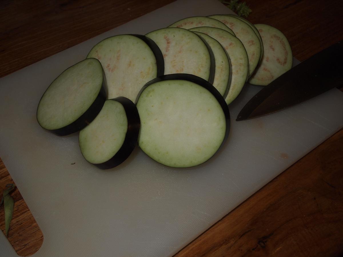 Mientras se hace la salsa, lavar y cortar las berenjenas en rodajas extender y salpimentar.