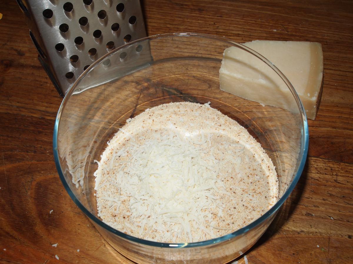En un bol mezclar el pan rallado con dos cucharadas de parmesano rallado.