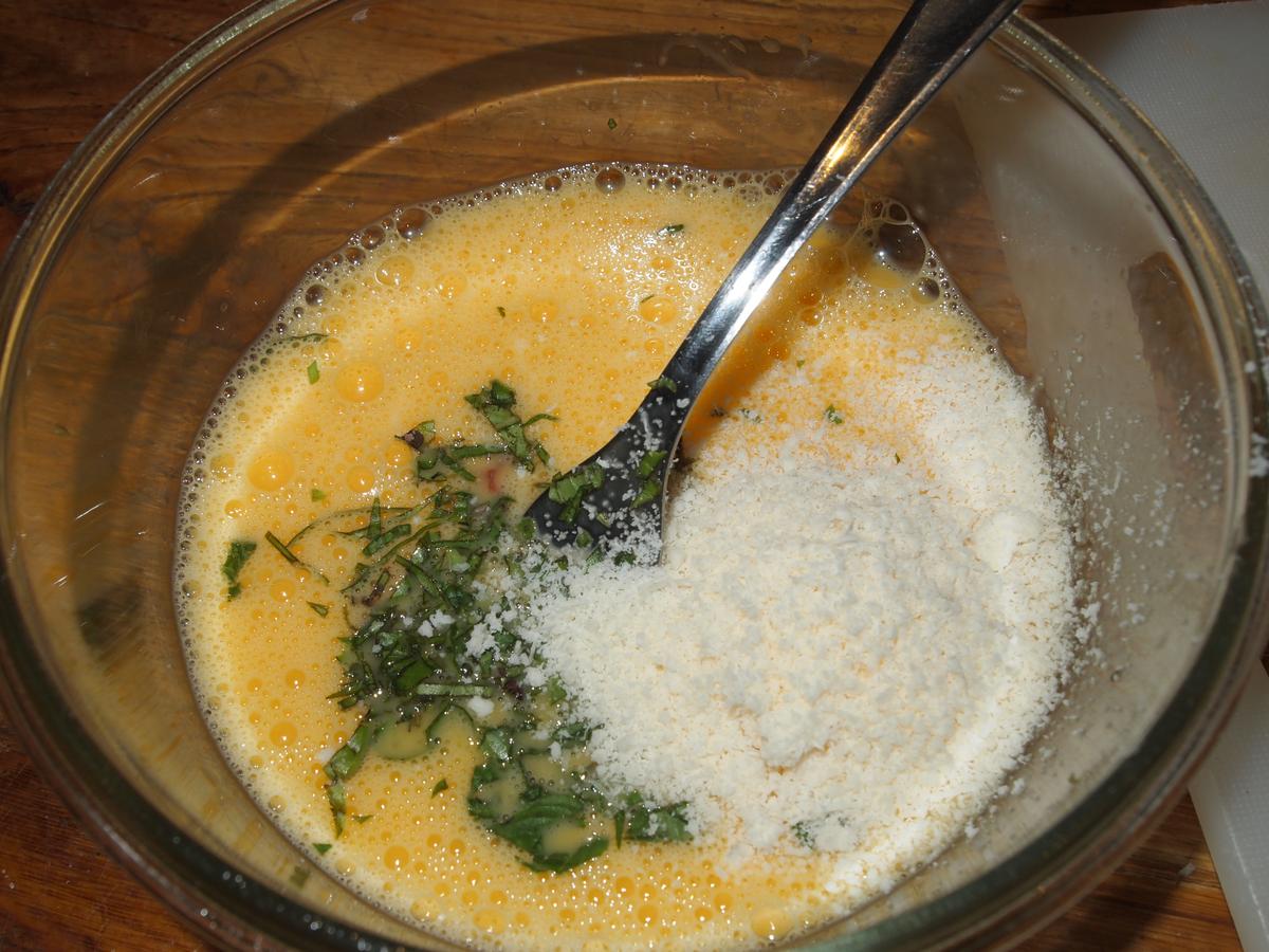 En otro bol batir los huevos, salpimentar y agregar unas hojas de albahaca picada.