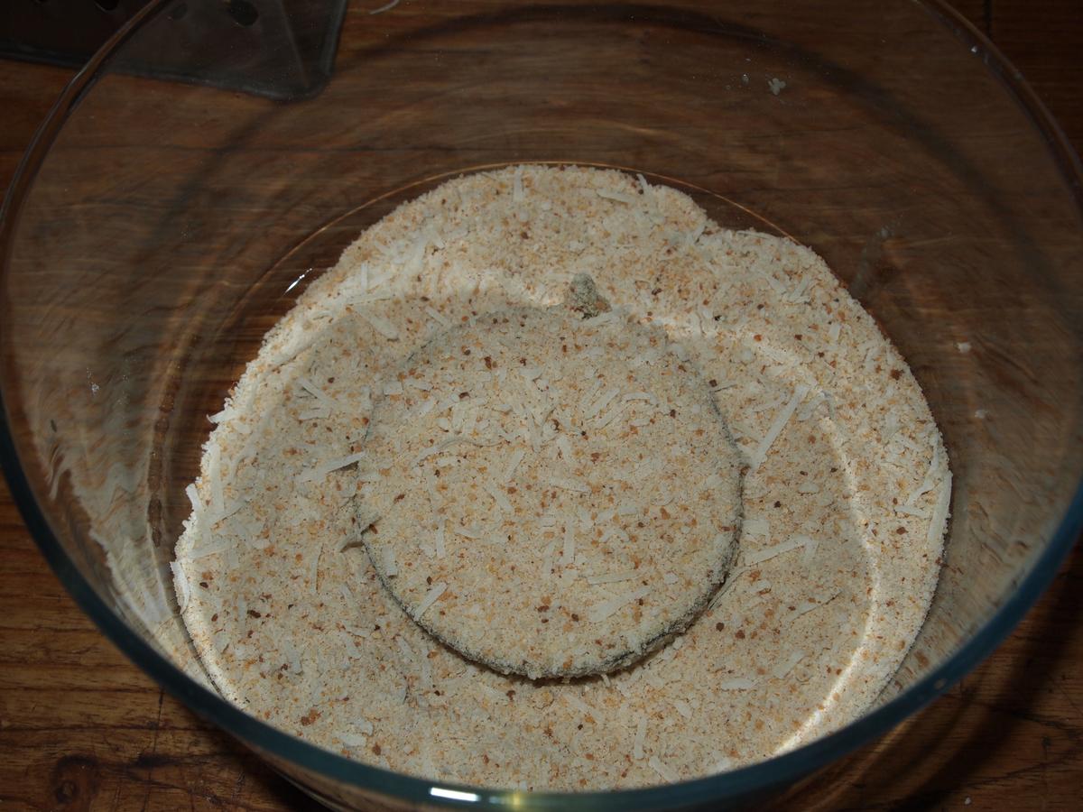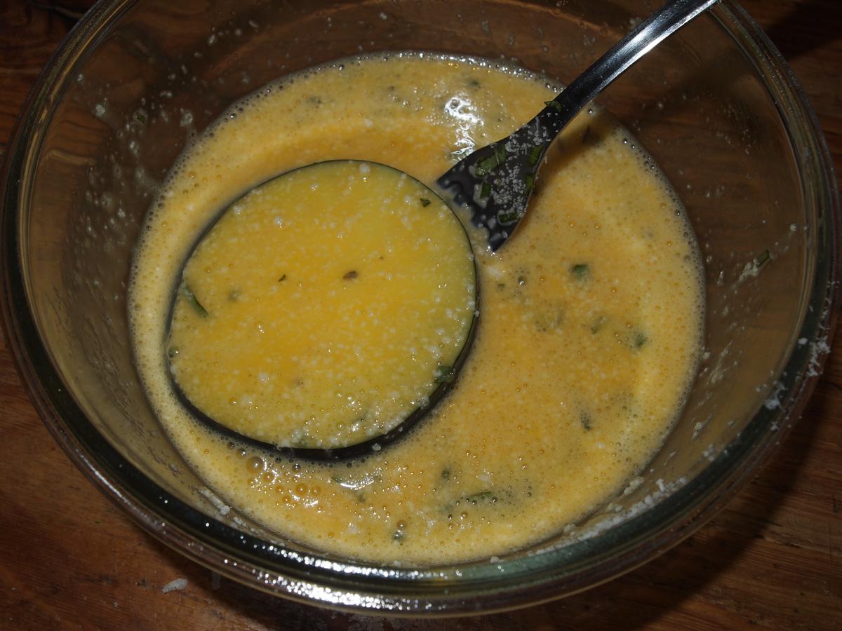 Bañar las rodajas de berenjena en la mezcla de huevo batido.