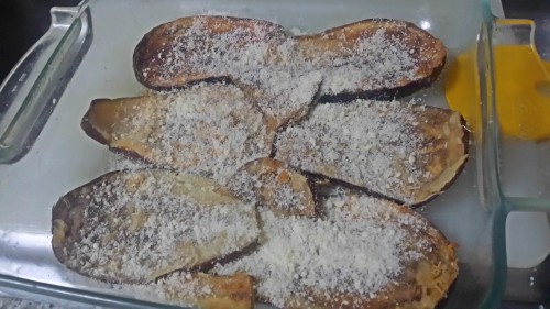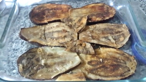 Cortar la berenjena por la mitad y dejarla reposar en un colador cubierta de sal para eliminar el líquido amargo que desprende.