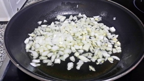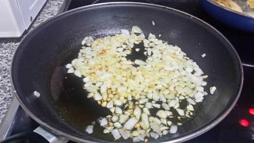 En una sartén amplia calentar el aceite y la mantequilla y sofreír el ajo y la cebolla.