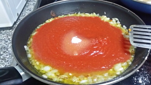 Añade la harina y mézclalo todo. Añade la pulpa de tomate, el chile y la albahaca.