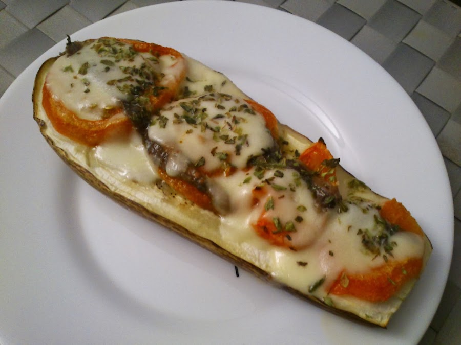 Partir la berenjena por la mitad, hacer unos cortes por encima de cada una, echar un chorrito de aceite y repartir las rodajas de tomate por encima. Meter en el horno precalentado durante 35 minutos a 220 gr. Pasado ese tiempo tienen que estar casi echas. Ponéis las anchoas por encima, 3 en cada parte y un poco de queso mozzarela. Espolvoreamos con un poco de orégano y volvemos a meter en el horno durante 10 minutos más. Sacar y comer! Riquísimo!