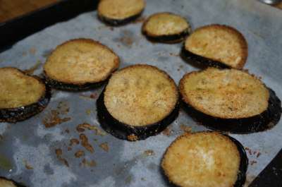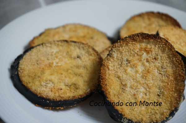 Yo solo las he rebozado con pan rallado, pero al pan se le puede añadir un poco de ajo y perejil, también se puede poner un poco de queso rallado por encima de las berenjenas cuando las pongáis en la fuente de horno.