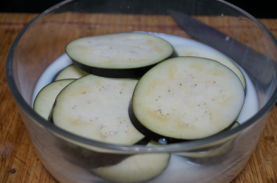En un bol ponemos el vaso de leche y añadimos las berenjenas, si no quedan cubiertas con la leche, se le puede añadir un poco de agua y mezclar con la leche. Las dejamos unos 30 minutos, las vais moviendo para que todas las rodajas se vayan remojando.