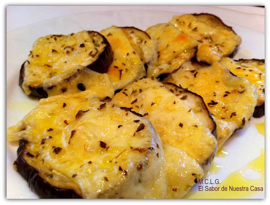 Pasado el tiempo, colócalas en un fuente, cubre cada rodaja con una loncha de queso, espolvoréalas con orégano y mételas en el horno, con el grill, unos minutos hasta que se derrita el queso y se dore un poco.Nota: esta receta tiene pocas calorías; así que...adelante...sin miedo!!!