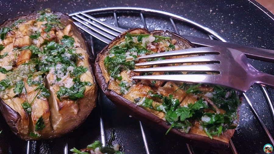 Para hoy tengo un plato de comida sana; una sabrosas berenjenas asadas y marinadas con finas hierbas.