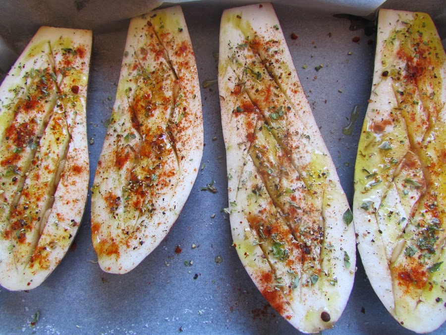 No pongo cantidades, pero ya ves en la foto como van. Se cortan las berenjenas a lo largo, se le hacen unos cortes sin llegar al fondo, se introducen los piñones en los cortes, se salan, y se les echa el orégano, el pimentón y el aceite de oliva