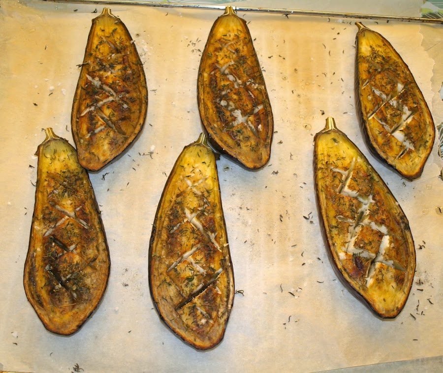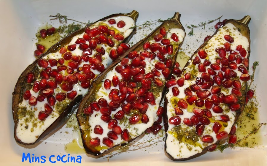 - Para servir el plato ponemos las berenjenas sobre una fuentes. Añadimos por encima abundante salsa, espolvoreamos al gusto con za"atar y ponemos bastantes semillas de granada por encima. Terminamos con las ramitas de tomillo y un chorrito de aceite. Os aseguro que es uno de los platos más maravillosos que he probado. Una auténtica delicia!