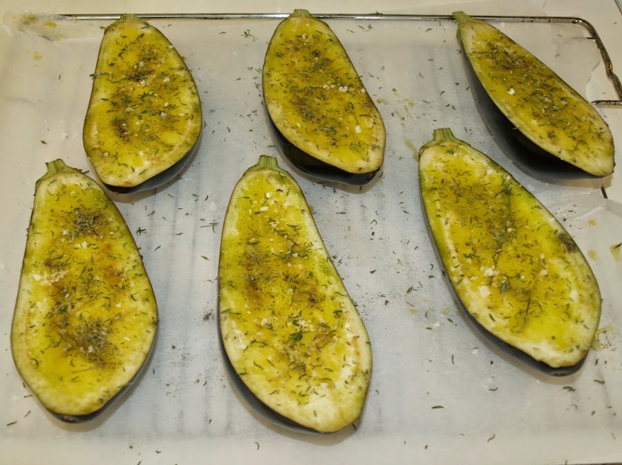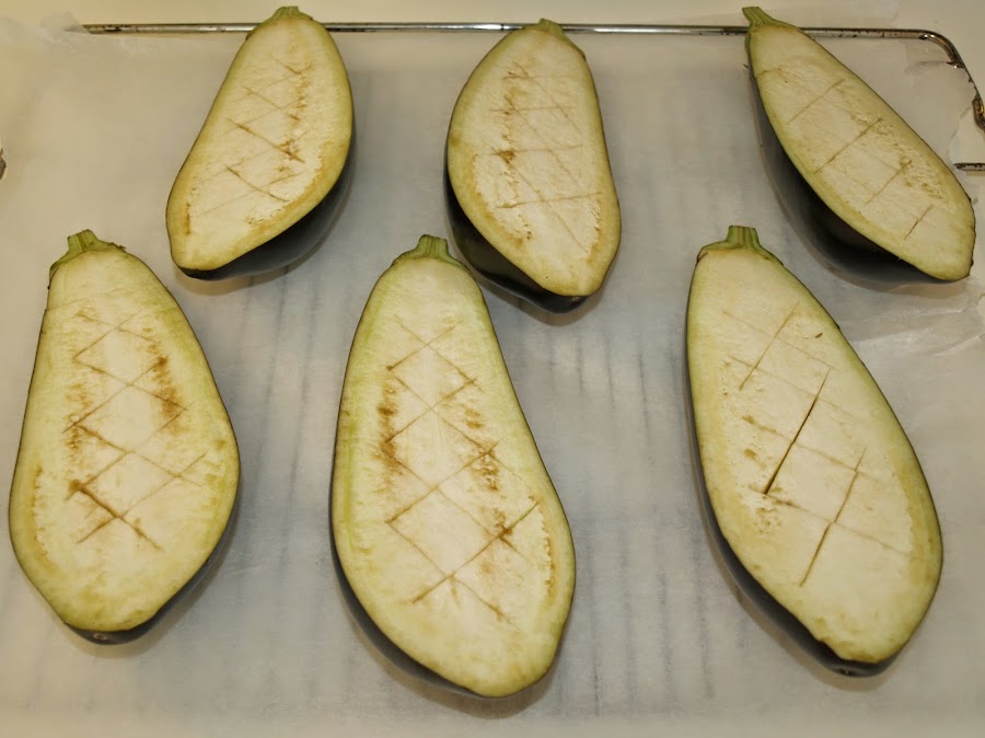- Ponemos el horno a calentar a 200º C arriba y abajo, y mientras cortamos las berenjenas por la mitad (dejando el tallo para que queden más bonitas al presentarlas a la mesa. Pero ojo, no se come!). Les hacemos unos cortes profundos por la cara cortada, sin llegar a atravesar la berenjena por completo. Los hacemos hacia un lado y luego hacia el otro, de forma que se corten entre sí como una X o formen un rombo (mirad la foto).
