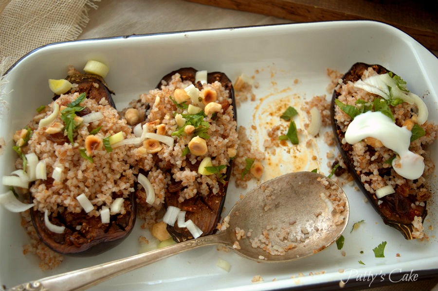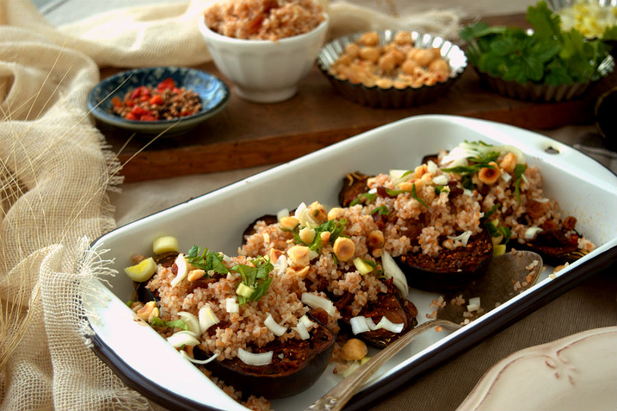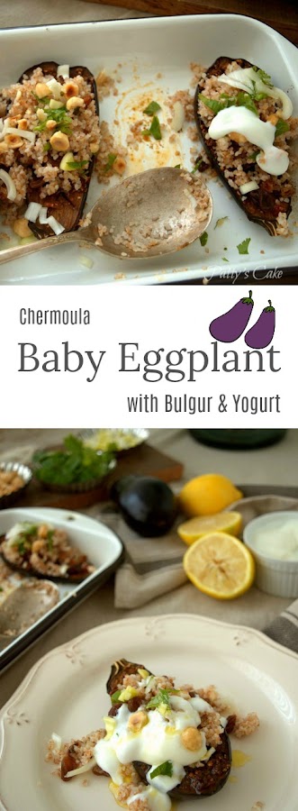 CHERMOULA BABY EGGPLANT WITH BULGUR AND YOGURT
