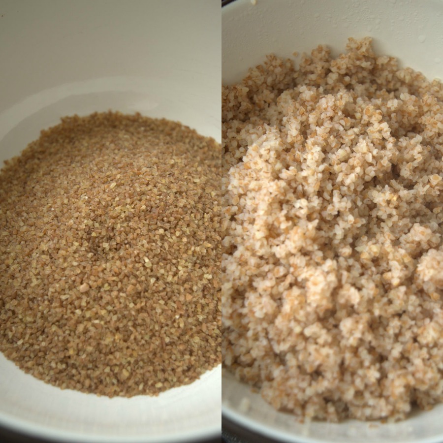 En un bol grande, ponemos el bulgur y le echamos el agua hirviendo. Removemos, tapamos con un paño o una tapadera y lo dejamos que se haga unos 8-10 minutos hasta que esté blando.