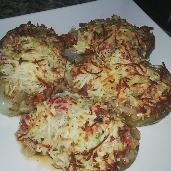 10- Cuando esté todo pochado cancelar y verter en un bol, donde ya habremos puesto el atún bien escurrido. Mezclar bien y rellenar las berenjenas.