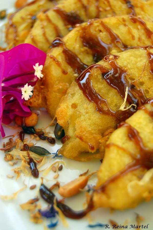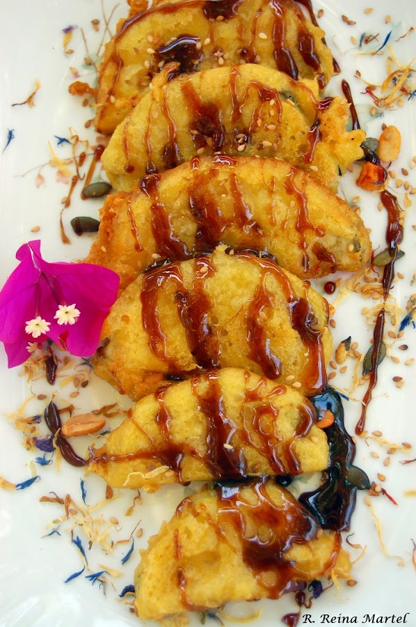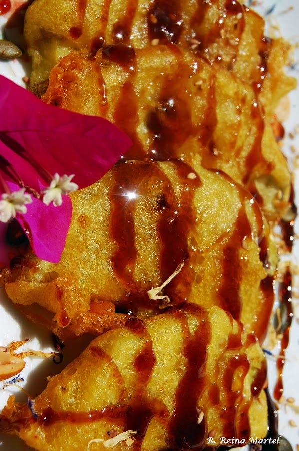 Pasar las Berenjenas por Harina primero y luego por la masa descrita, freír en abundante Aceite caliente, por supuesto que sea de Oliva.