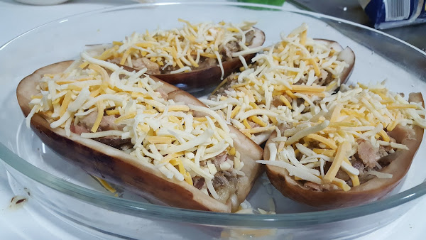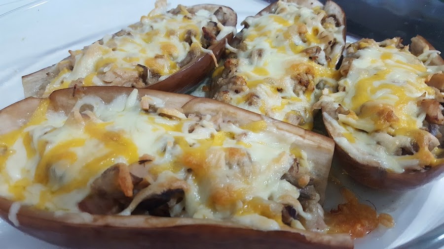 9.- En una bandeja tipo pirex, ponemos las berenjenas rellenas y las espolvoreamos con el queso rallado.