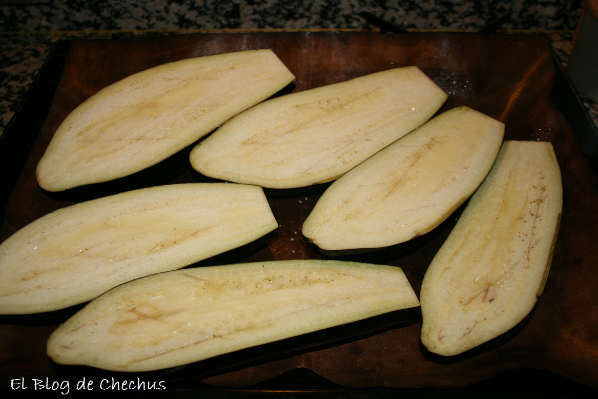 Lo primero que hacemos es lavar las berenjenas, cortamos el rabo y las partimos por la mitad. Yo le hago unos cortes, las pincelo con aceite y sal y las meto al horno a 220º unos 35 minutos.